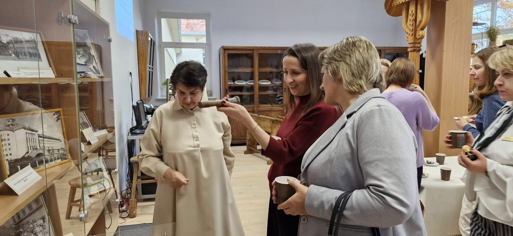 Progimnazijos direktorė Rūta Songailienė pasitiko dalyvius jaukioje mokyklos muziejaus erdvėje, vaišindama kava ir sausainiais. Savo sveikinimo žodyje ji pristatė pagrindines mokyklos kryptis – gabių mokinių ugdymą ir architektūros integravimą į ugdymo procesą.