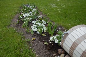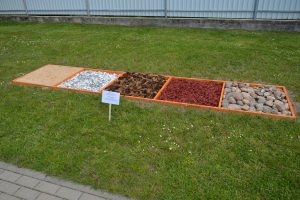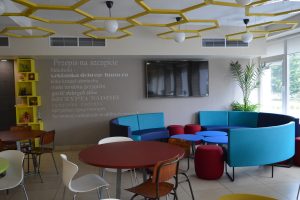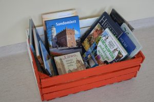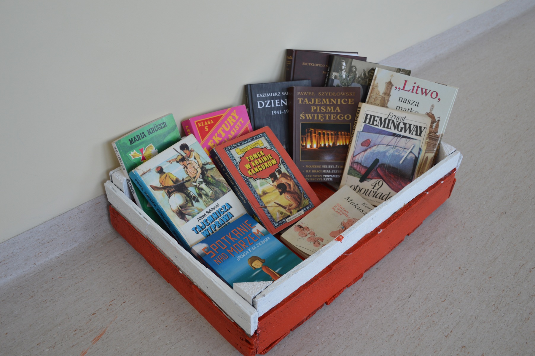 Lenkų kalbos kabinetų koridoriuje įrengtos mini bibliotekos — pačių vaikų iš parduotuvių atsineštos ir dekoruotos daržovių dėžės su knygomis įvairia tematika.